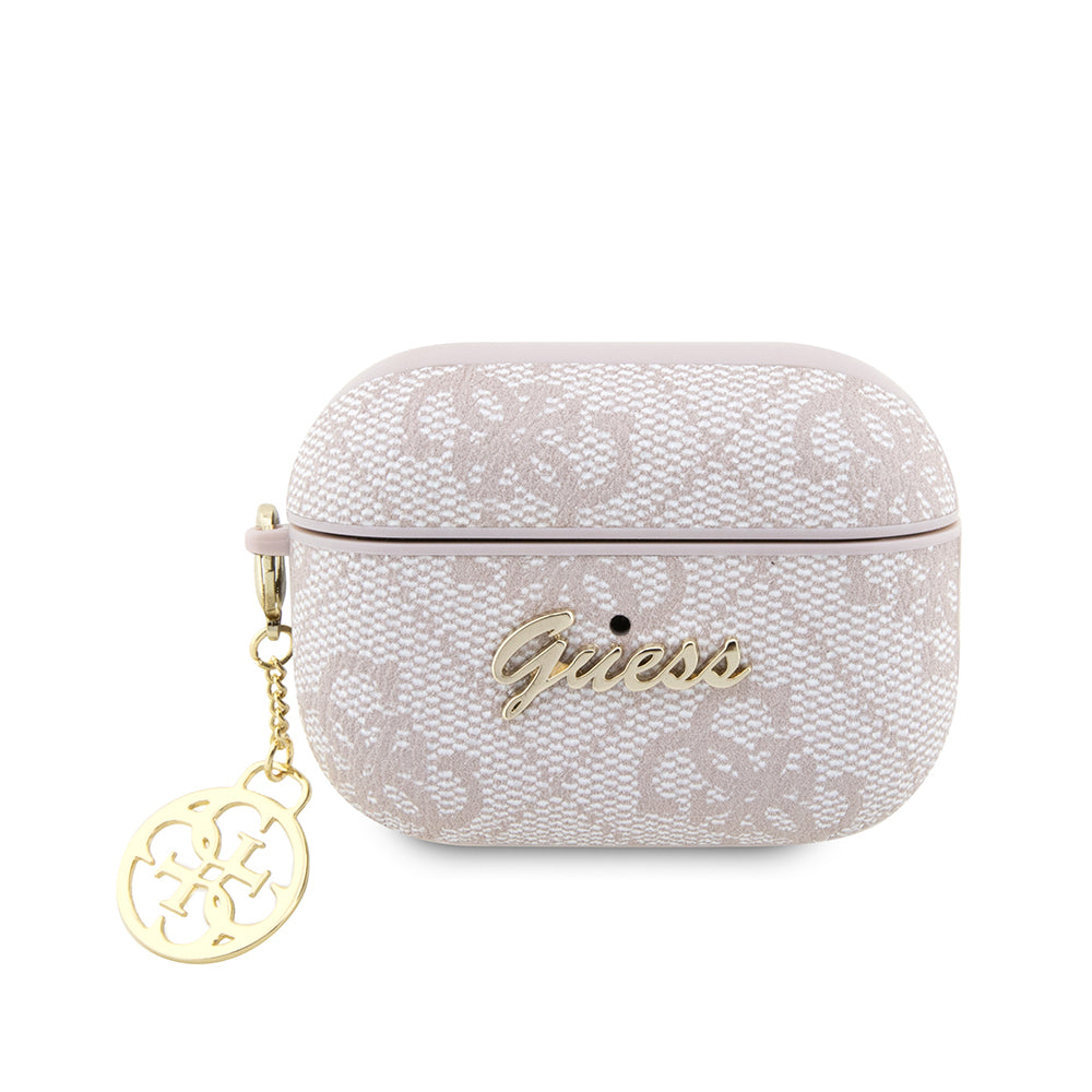 Apple Airpods Pro 2 Kılıf Guess Orjinal Lisanslı 4G Desenli Metal Script Logolu 4G Charm PU Deri Kapak Pembe