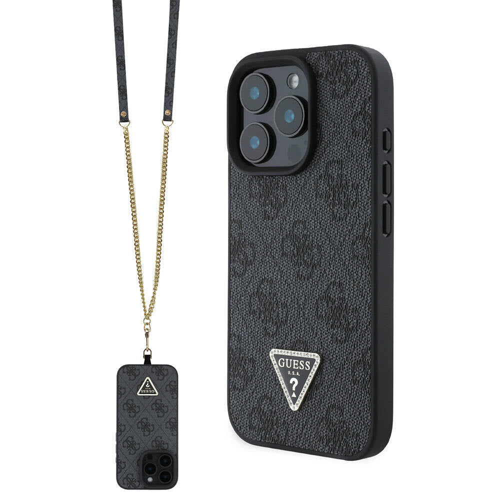 Apple iPhone 16 Pro Max Kılıf Guess Orjinal Lisanslı PU Deri Taşlı Metal Üçgen Logolu Çapraz Vücut Askılı 4G Desenli Kapak Siyah