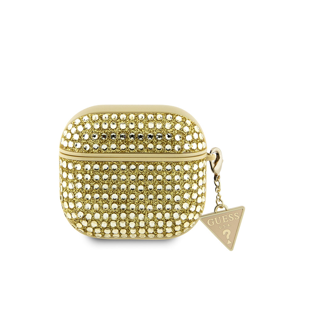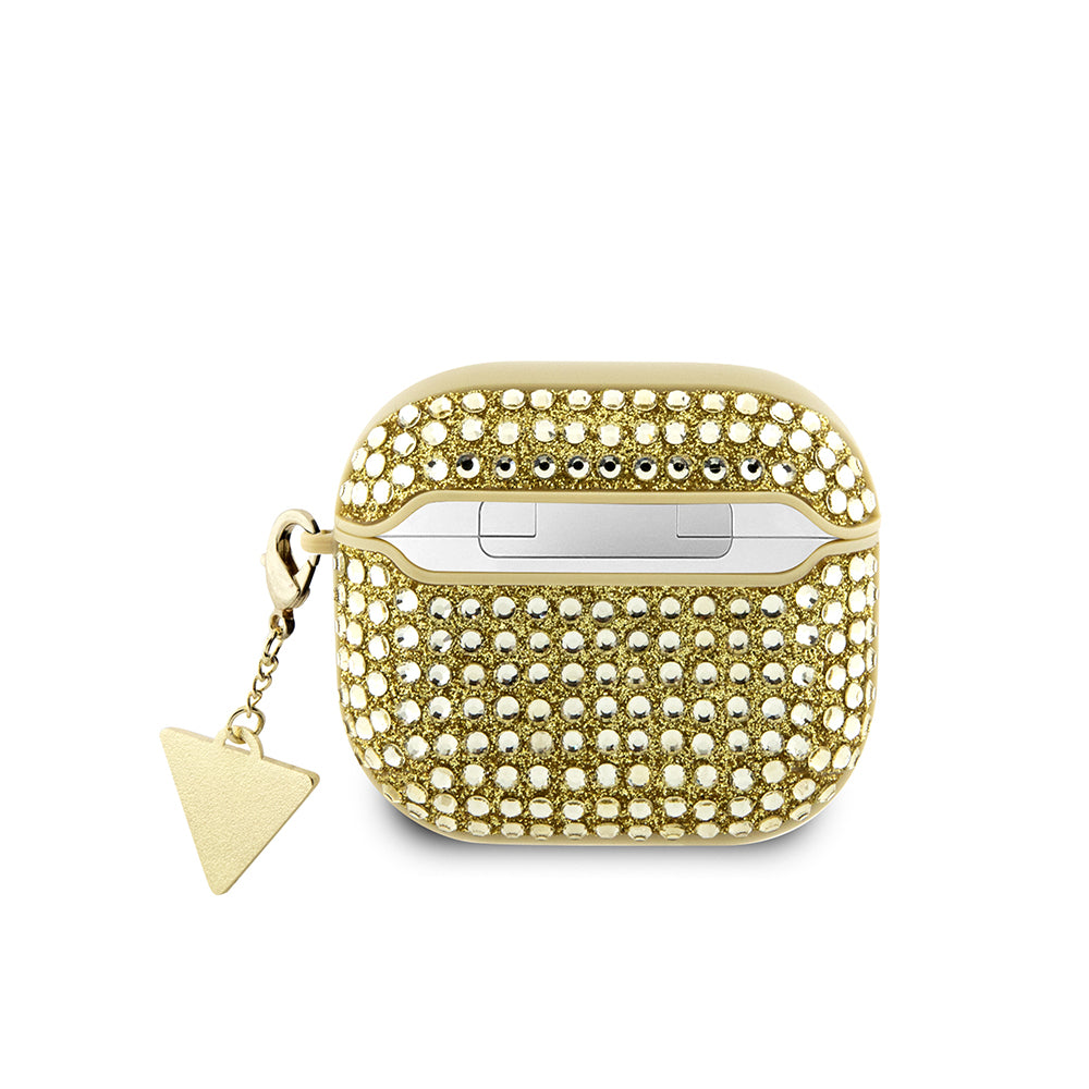 Apple Airpods 4 Case Guess Original Licensed Glitter Stone Coated Triangle Logo Ornament Chain Cover Gold
