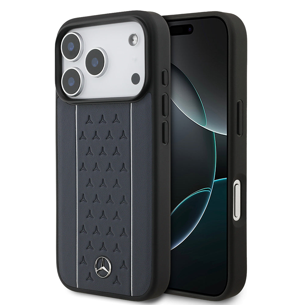 Apple iPhone 17 Pro Case Mercedes Benz Original Licensed M-Safe Charging Feature Striped Star Patterned Metal Logo Leather Cover Navy Blue