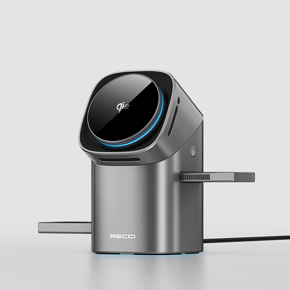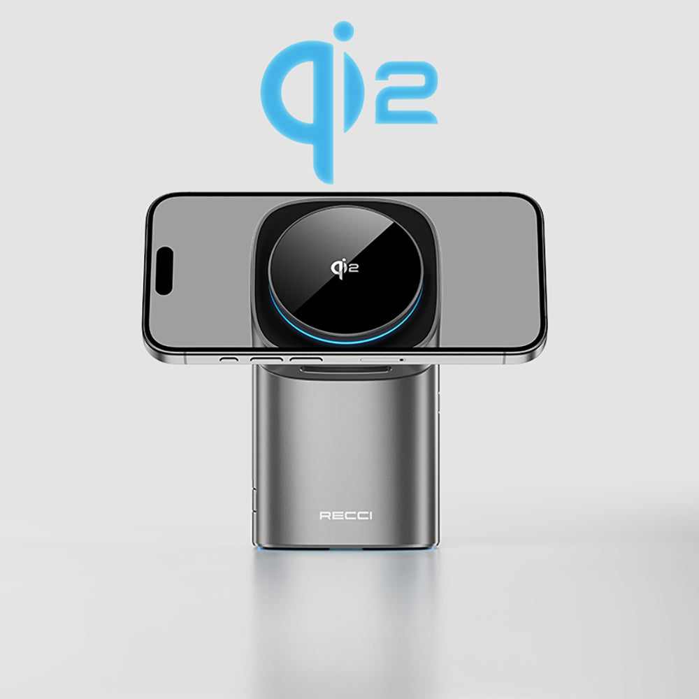 The Recci RW05 3-in-1 wireless charging stand, equipped with Qi2 charging technology, allows you to charge your iPhone, smartwatch, and wireless headphones simultaneously. Its strong magnetic attraction aligns your phone precisely, ensuring maximum charging efficiency.