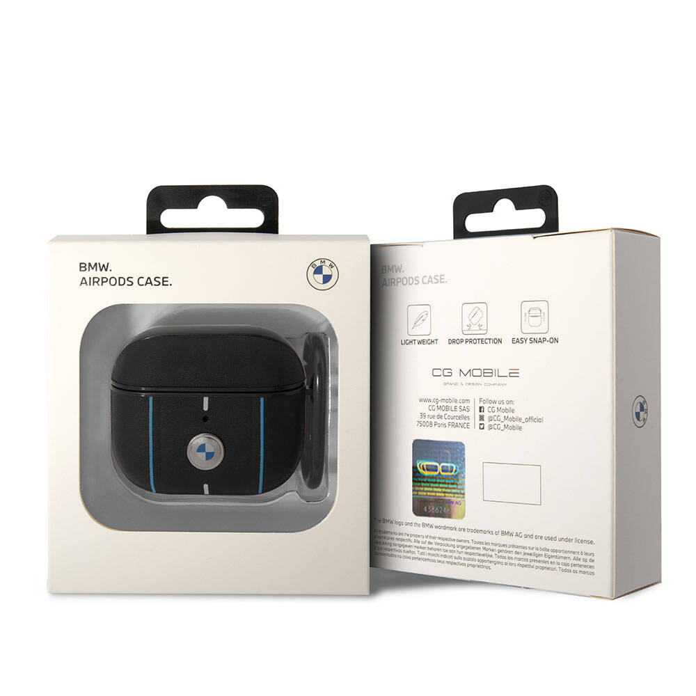 Apple Airpods 3.Nesil Kılıf BMW Orjinal Lisanslı PU Deri Mavi Beyaz Çizgili Metal Logolu Kapak Siyah