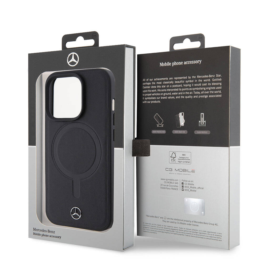 Apple iPhone 15 Pro Kılıf Mercedes Benz M-safe Şarj Özellikli Yumuşak Deri Orjinal Lisanslı Kapak Siyah