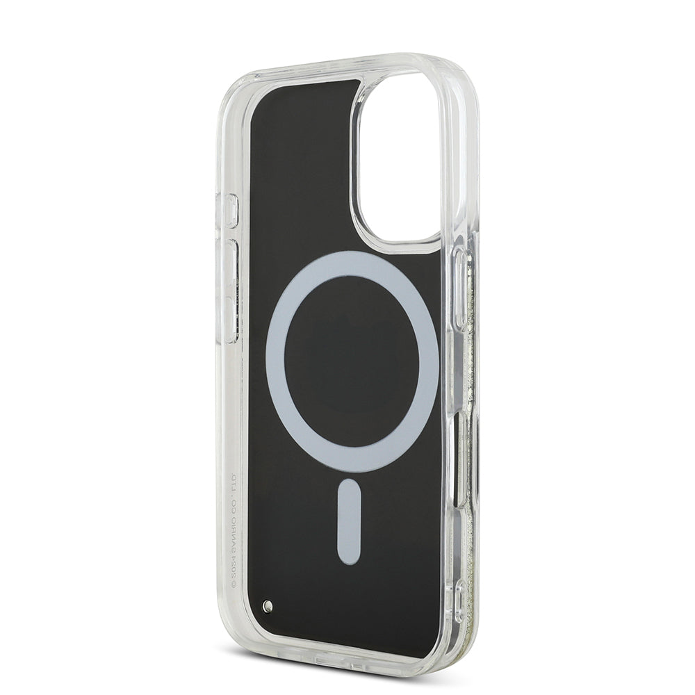 Apple iPhone 16 Kılıf Hello Kitty Orjinal Lisanslı M-safe Şarj Özellikli IML Baskı Kitty Head Logolu Sıvılı Simli Altın Ateşi Kapak Siyah