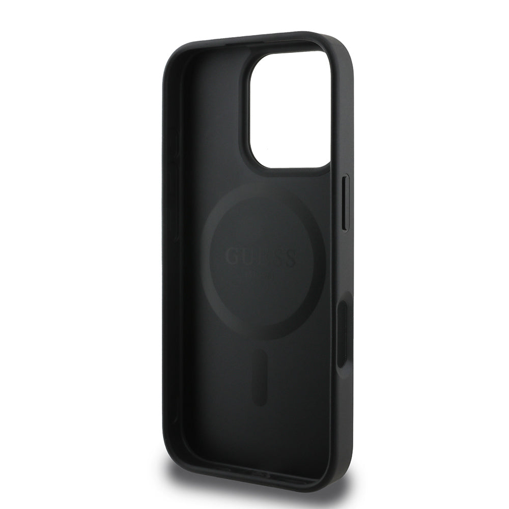 Apple iPhone 16 Pro Max Kılıf Guess Orjinal Lisanslı M-safe Şarj Özellikli PU Halkalı 4G Desenli Yazı Logolu Kapak Siyah