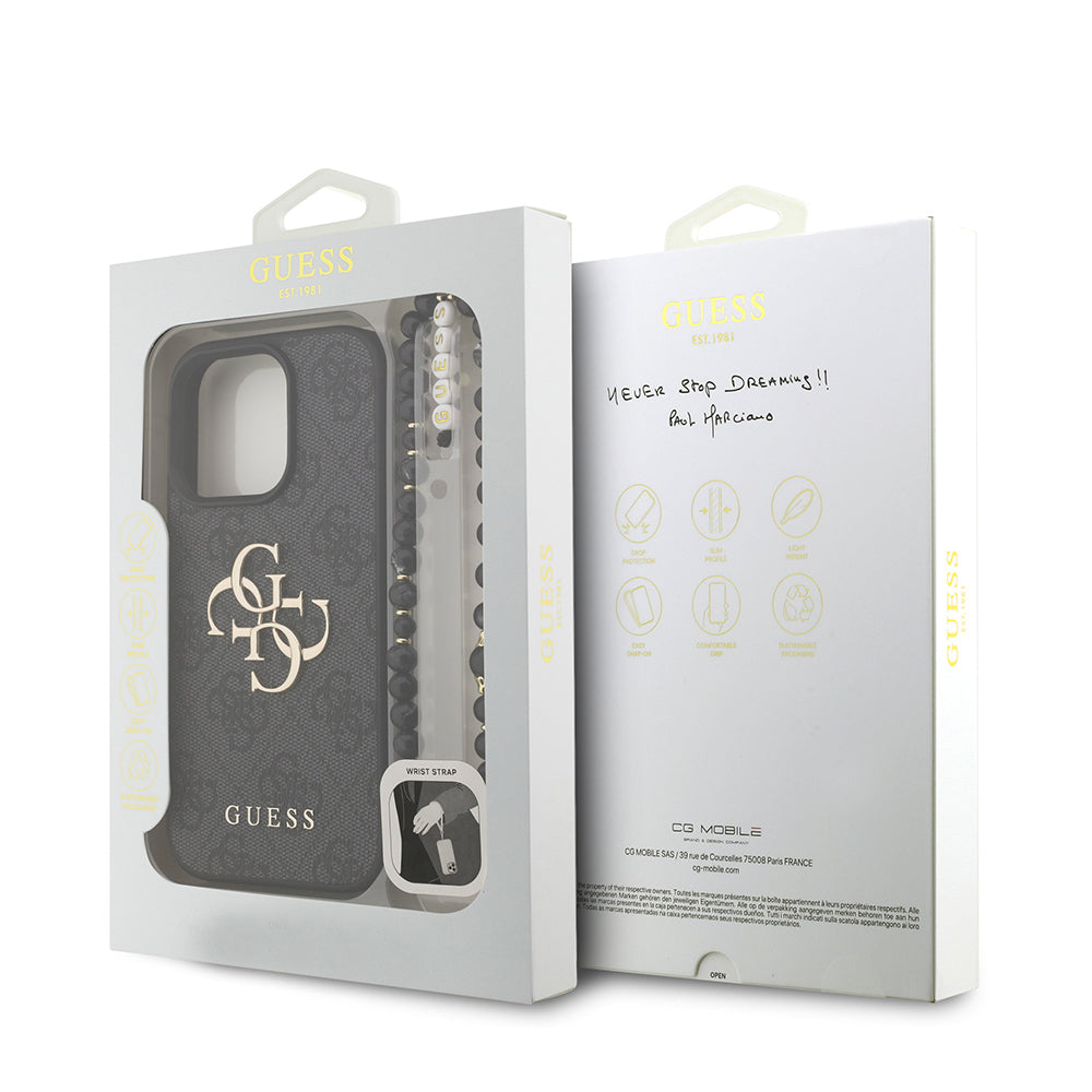 Apple iPhone 16 Pro Max Kılıf Guess Orjinal Lisanslı PU Deri Bilek Askı İpli Metal Büyük 4G ve Yazı Logolu Kapak Siyah