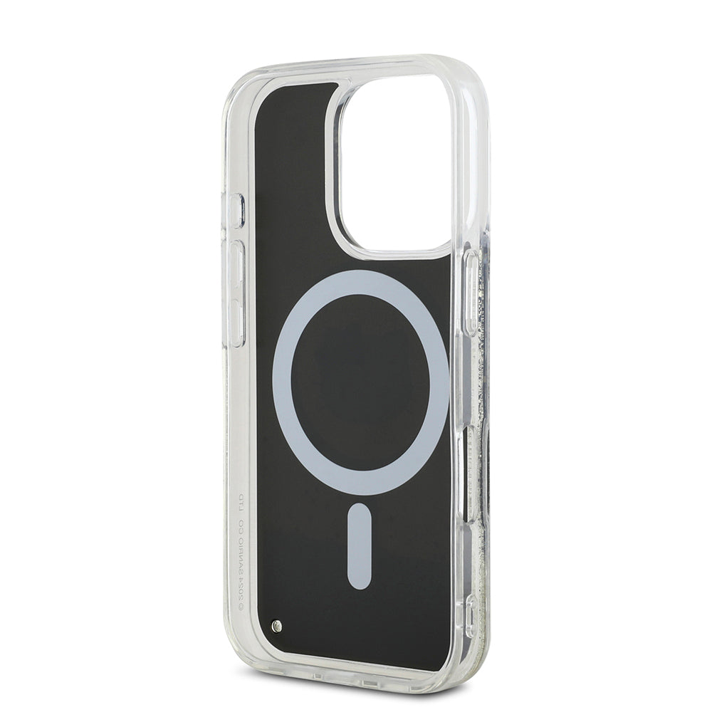 Apple iPhone 16 Pro Max Kılıf Hello Kitty Orjinal Lisanslı M-safe Şarj Özellikli IML Baskı Kitty Head Logolu Sıvılı Simli Altın Ateşi Kapak Siyah