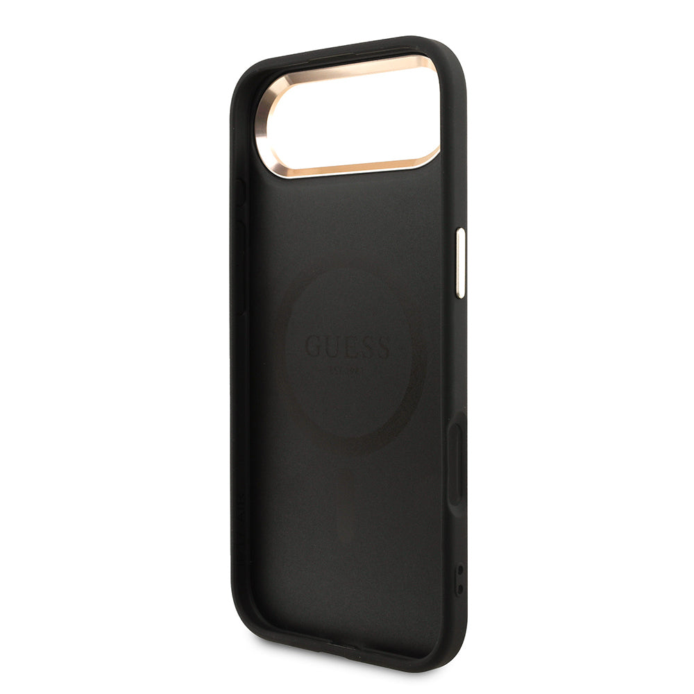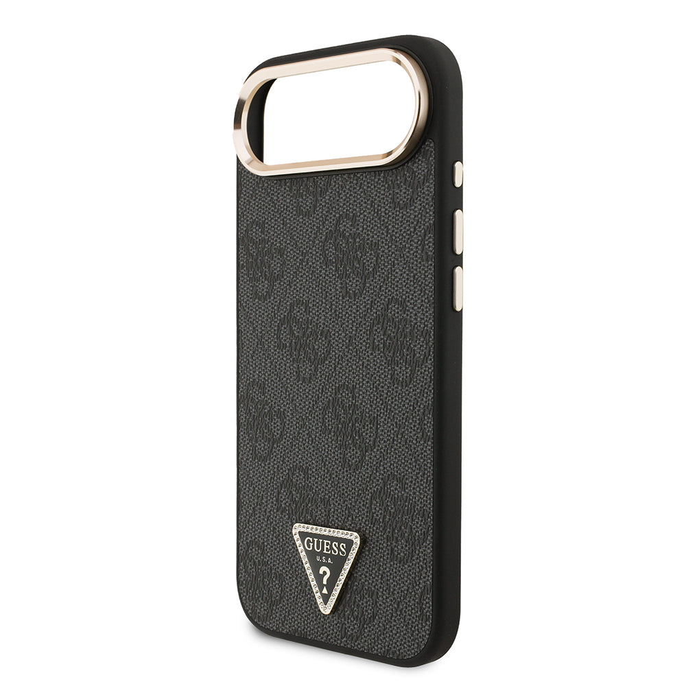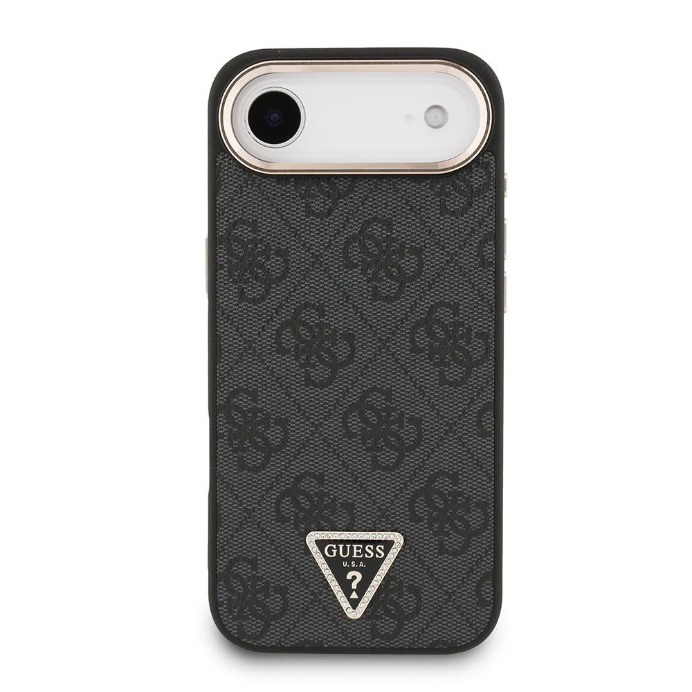 Apple iPhone 17 Air Kılıf Guess Orjinal Lisanslı M-safe Şarj Özellikli Gold Metal Kamera Çerçeveli Taşlı Üçgen Logo 4G Desenli Kapak Siyah
