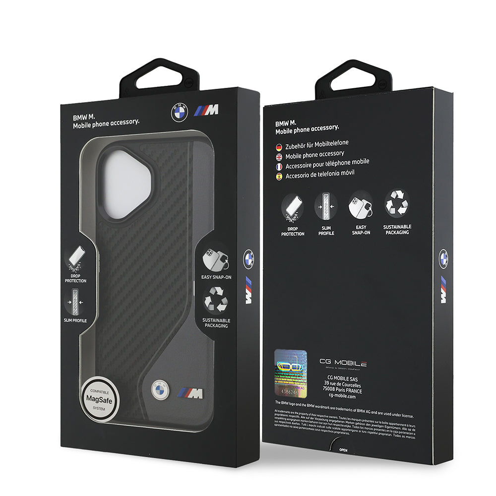 Apple iPhone 17 Kılıf BMW Orjinal Lisanslı M-safe Şarj Özellikli Metal BMW ve M Logolu PU Karbon Tasarımlı Kapak Siyah