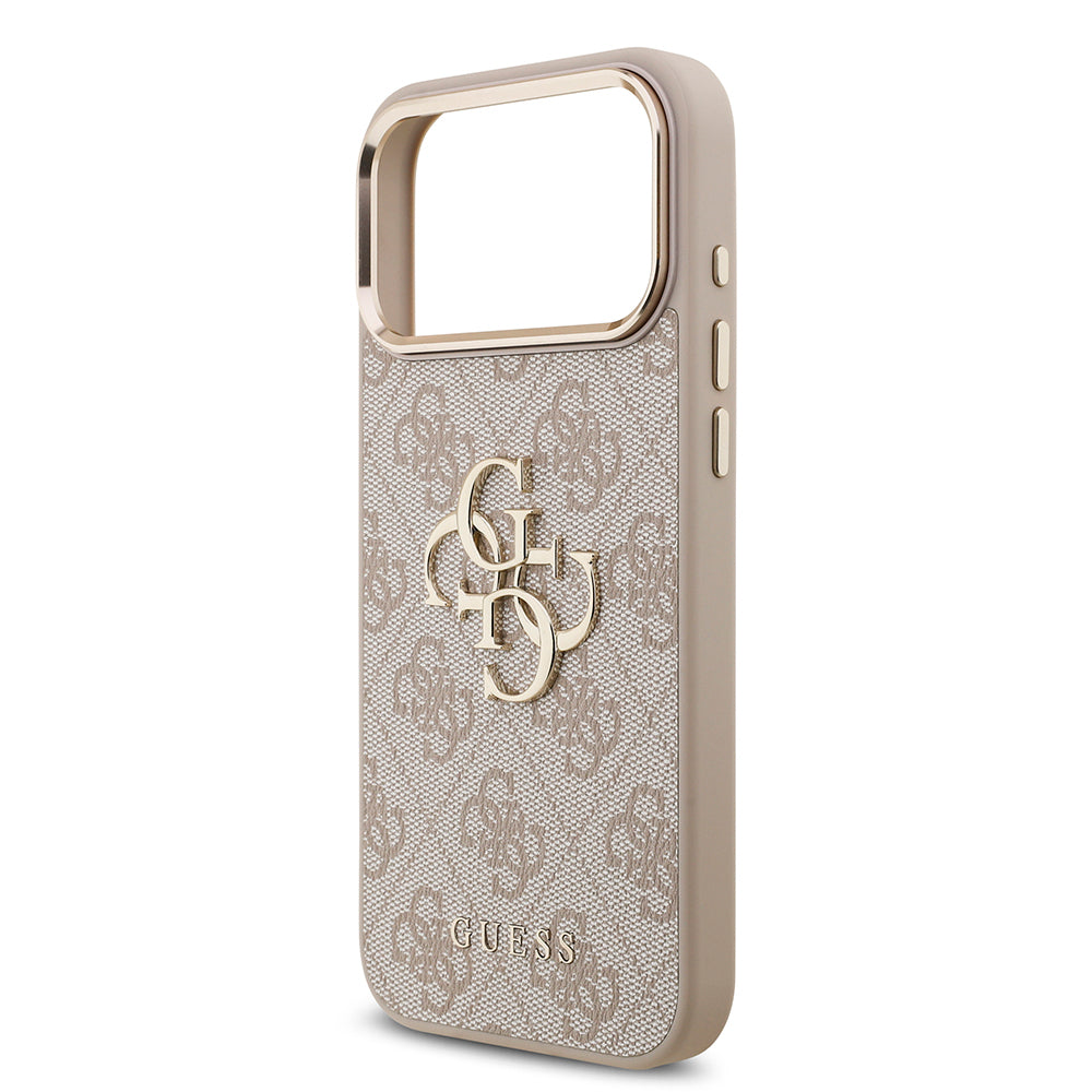 Apple iPhone 17 Pro Max Kılıf Guess Orjinal Lisanslı Gold Metal Kamera Çerçeveli 4G Desenli Metal Büyük 4G ve Yazı Logolu Kapak Kahverengi