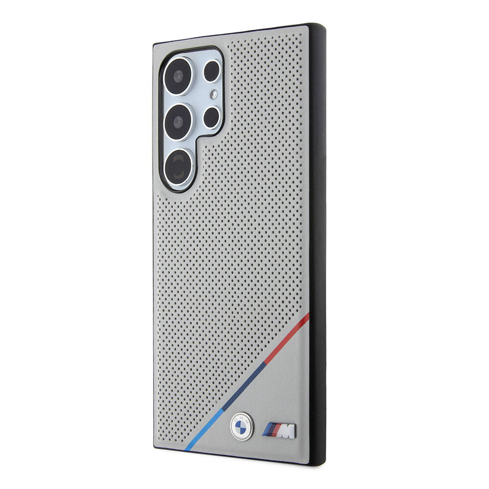 Galaxy S24 Ultra Kılıf BMW Orjinal Lisanslı M-safe Şarj Özellikli M Logolu Üç Çizgili Delikli Deri Kapak Gri