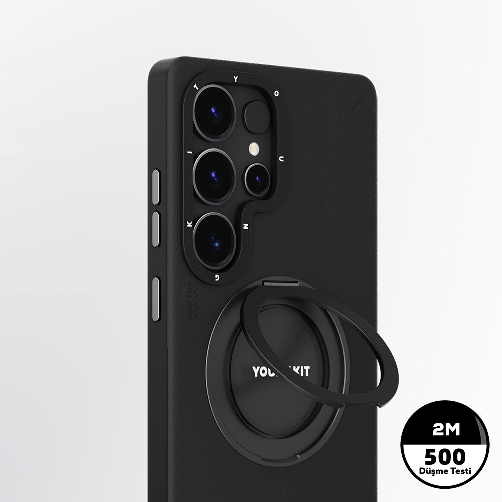 Galaxy S25 Ultra Kılıf M-safe Şarj Özellikli 360° Standlı Basit Mat Deri Desenli Youngkit Tech Leather Serisi Kapak Siyah