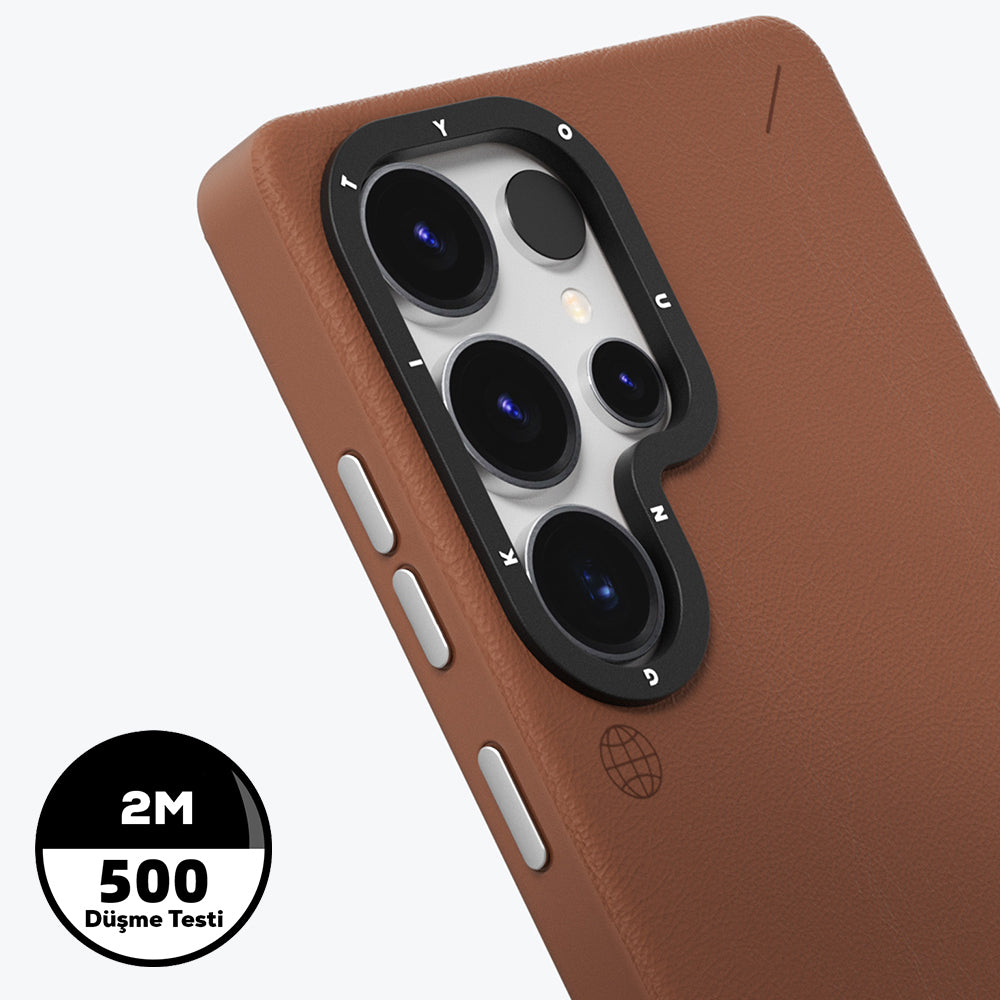 Galaxy S25 Ultra Kılıf M-safe Şarj Özellikli Basit Mat Deri Desenli Youngkit Tech Fashion Serisi Kapak Kahverengi