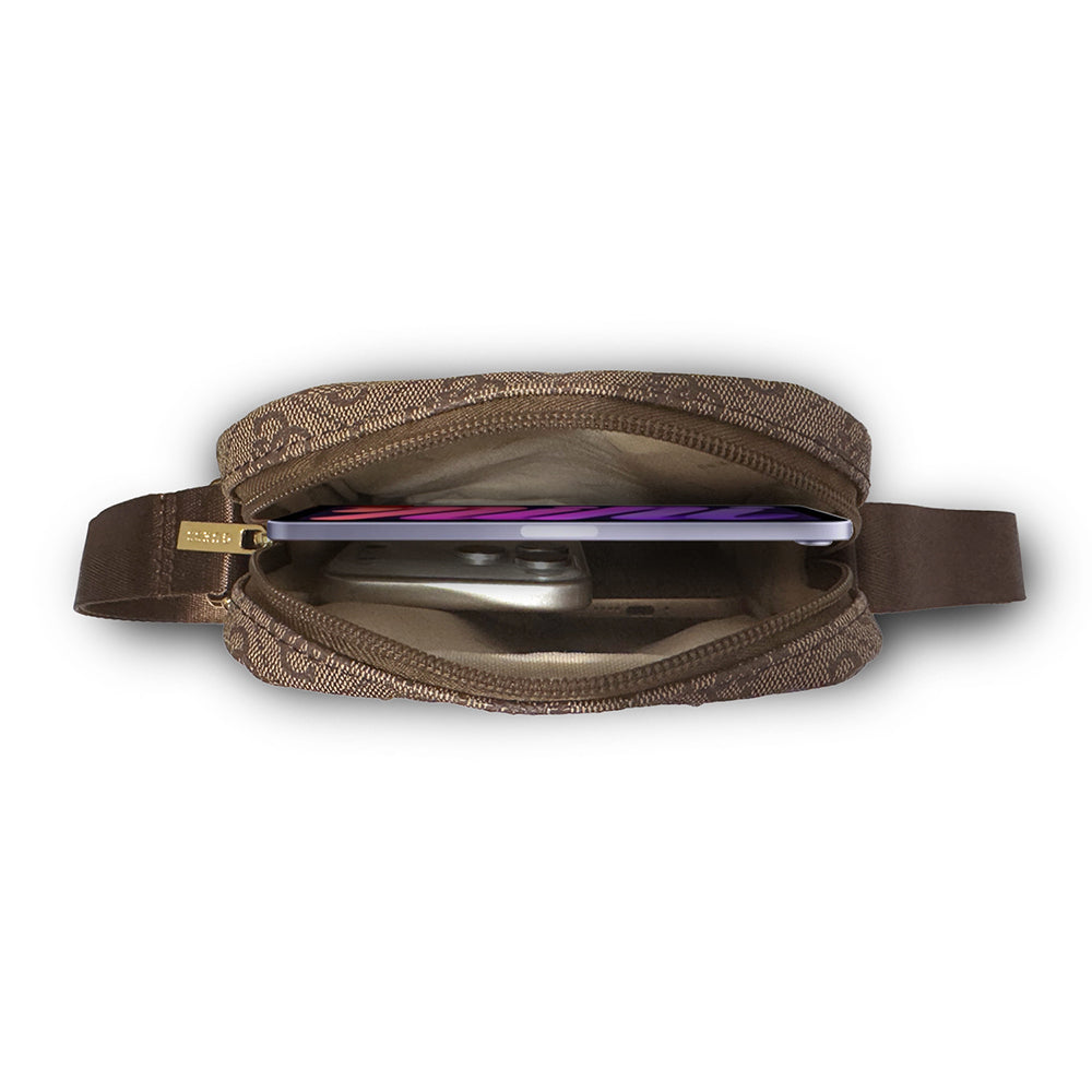Guess Orjinal Lisanslı Metal Logolu Fermuarlı 8 inç Çapraz Askılı Tablet Çantası Kahverengi