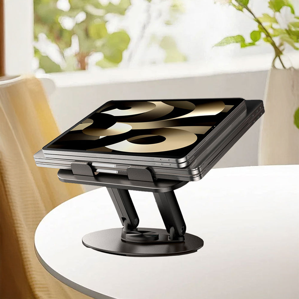 Tam 360 derece dönebilen taban yapısı, istediğiniz her açıya kolaylıkla dönebilmenizi sağlar. Çok açılı ayar mekanizması sayesinde ister video konferanslarda, ister çizim veya film izleme anlarında ekranınızı en ideal pozisyona getirebilirsiniz. Çift amortisörlü menteşe yapısıyla açıldığında sabitliğini korur, hareket etmez ya da sallanmaz. Evde sabit ofis masasında veya taşınabilir bir çalışma köşesinde bu fonksiyonel stand size büyük kolaylık sunar.