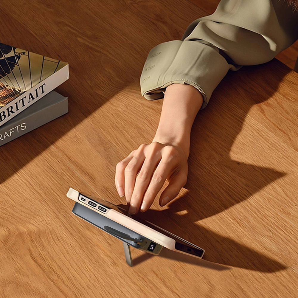 PW1009D, entegre stand tasarımı sayesinde telefonunuzu yatay ya da dikey olarak sabitlemenize olanak tanır. Böylece video izlerken, canlı yayın yaparken ya da toplantılara katılırken ellerinizi serbest bırakabilirsiniz. Kompakt boyutlarıyla çantanızda kolayca taşınabilir; ister ofiste masa başında ister kafede dinlenirken kullanabileceğiniz pratik bir şarj çözümü sunar.