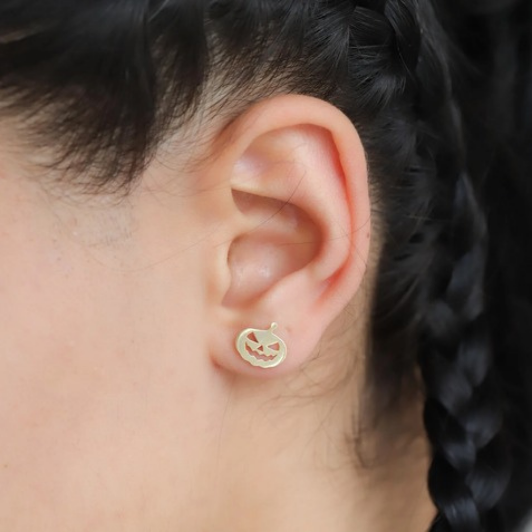 Tasarım: Balkabağı siluetinde, göz ve ağız kısmı oyuk (cut-out) mini stud küpe; pürüzsüz yüzey ve kelebek (push-back) kilit