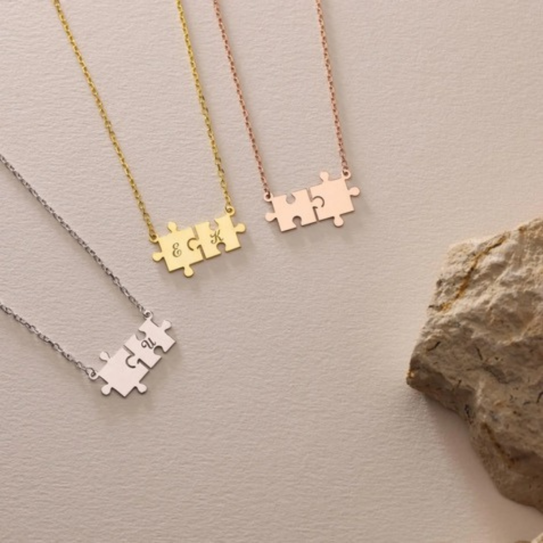 Bir araya geldiğinde tamamlanan iki yapboz parçası… Bu kolye, “sen ve ben” vurgusunu sade bir tasarımla anlatır. Düz, parlak yüzeyli plakaların modern duruşu; üzerine işlenen harf, tarih ya da kısa sembollerle kişisel bir hikâyeye dönüşür.