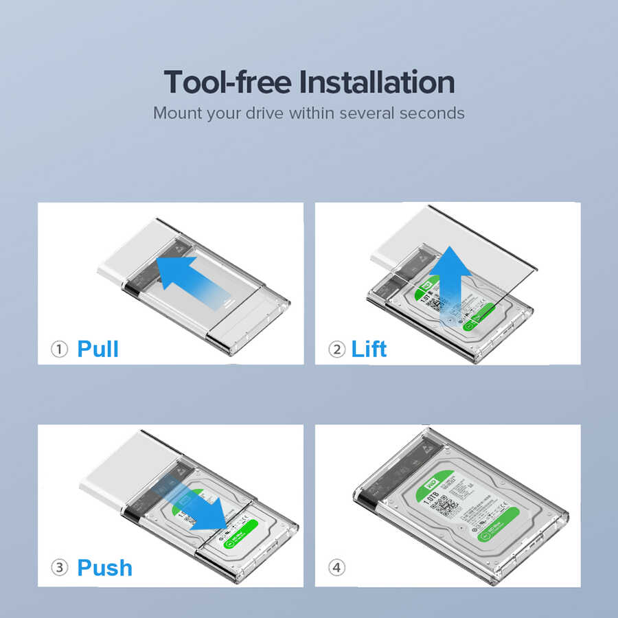 Şeffaf sert PC malzemesi ile harddiskiniz darbelere ve statik elektrikten kaynaklı bozulmalara karşı korunaklı olur