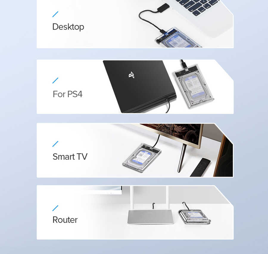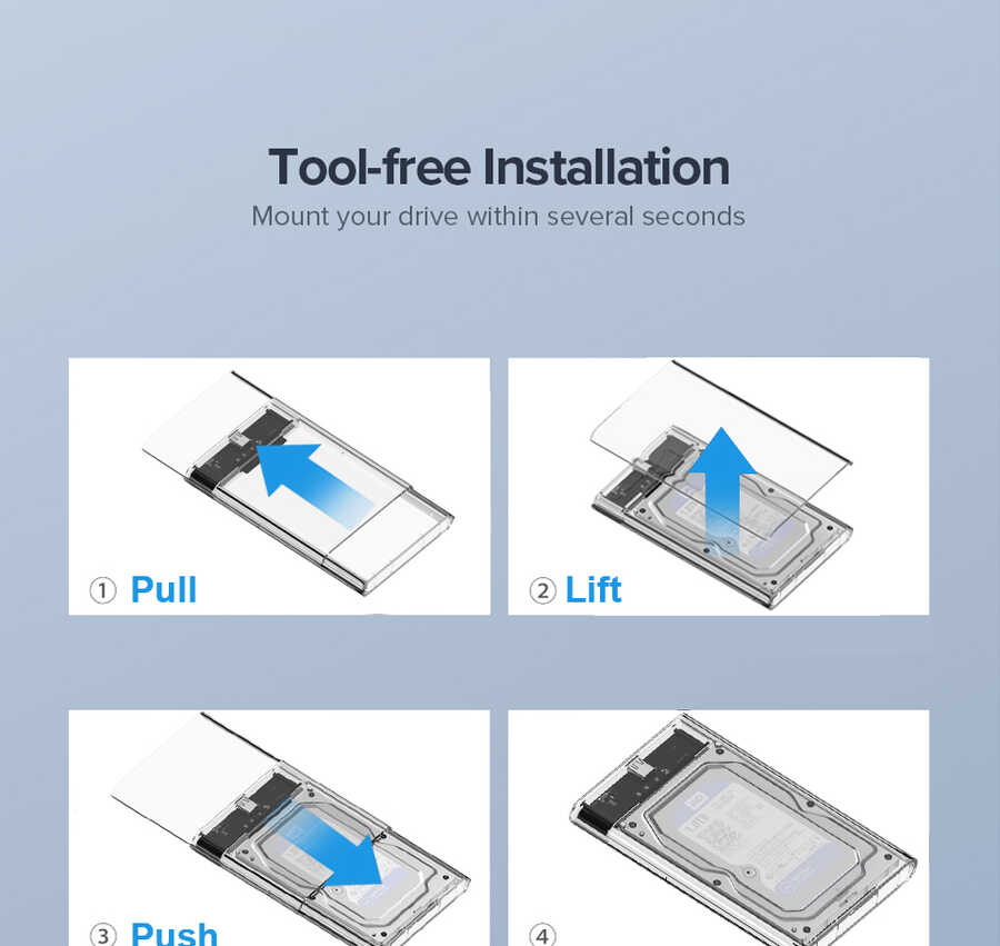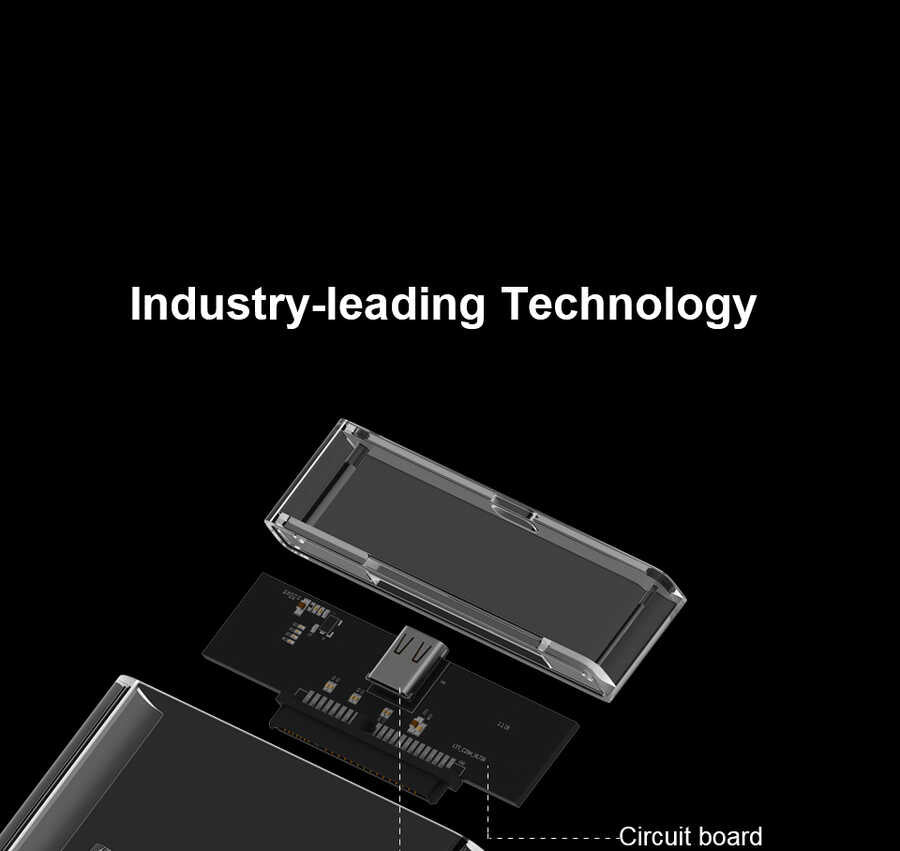 Şeffaf sert PC malzemesi ile harddiskiniz darbelere ve statik elektrikten kaynaklı bozulmalara karşı korunaklı olur
