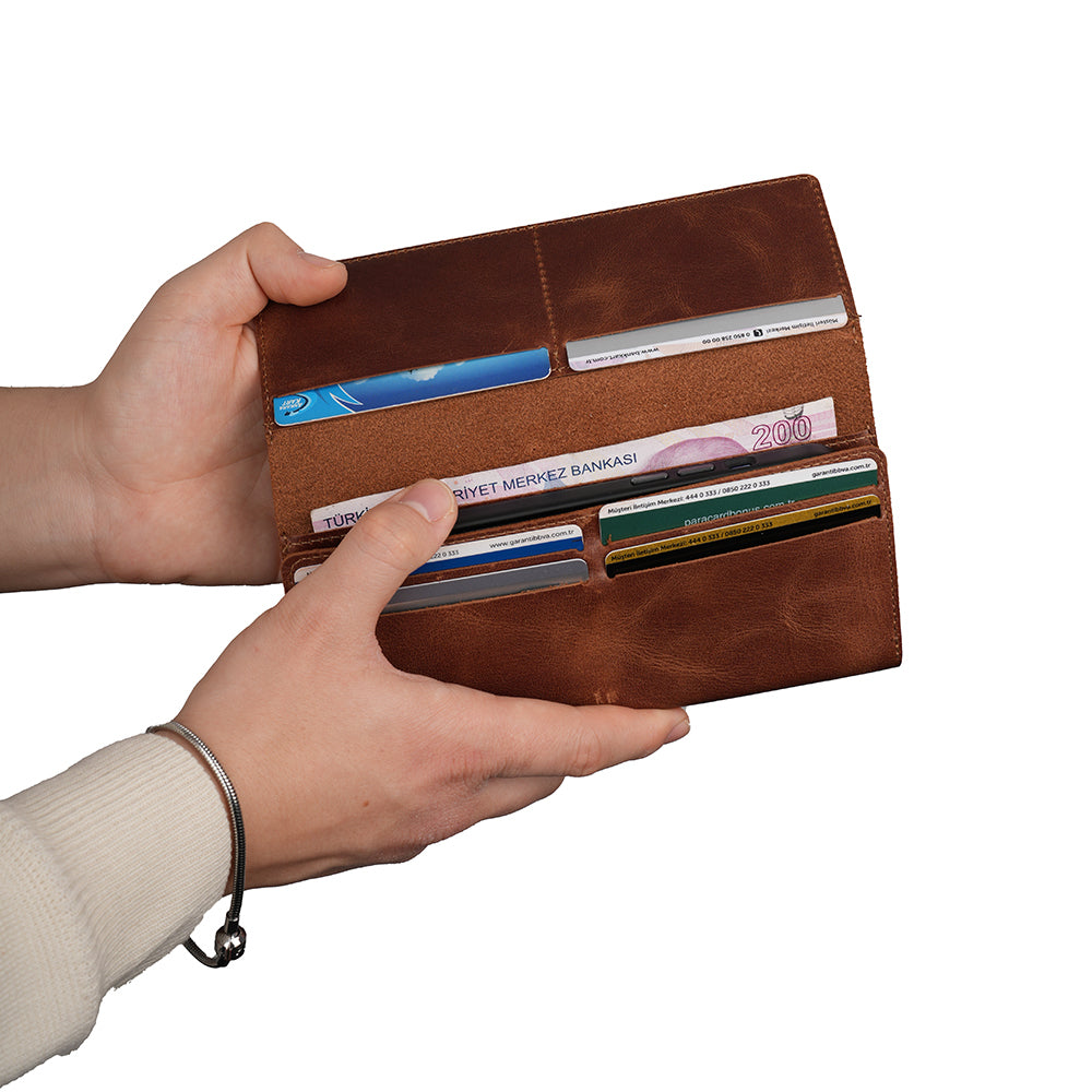Günlük hayatınızı kolaylaştıran bu özel cüzdan, telefon ve kart taşıma ihtiyacınızı tek bir yerde topluyor. Deri malzemesiyle zarif bir görünüm sunarken, güçlü dikiş detayları ve dayanıklı yapısıyla uzun ömürlü bir kullanım sağlıyor.